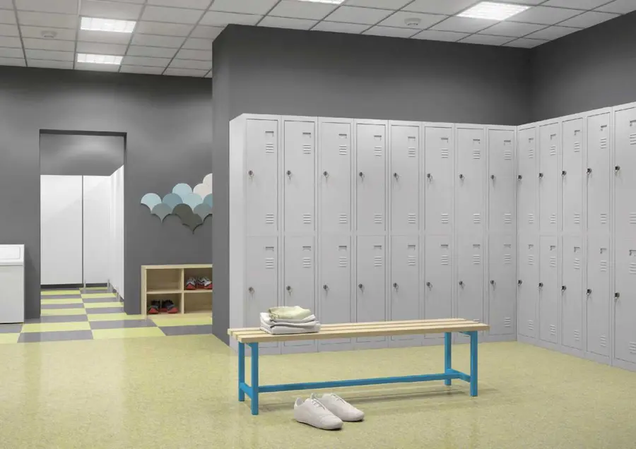 šatní lavička, sedací plocha z masivního dřeva, 450x1000x330 mm, konstrukce modrá