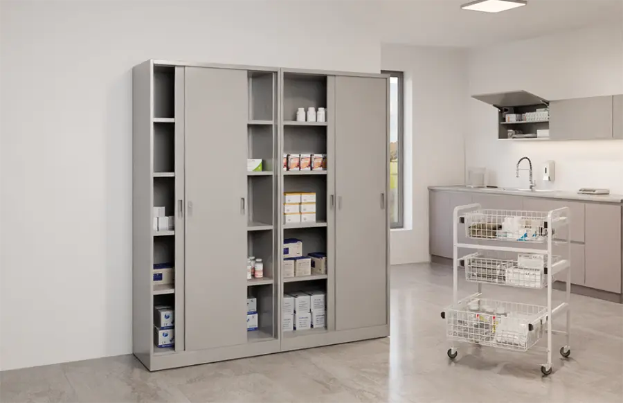 robustní kovová skříň určená pro bezpečné ukládání materiálů a dokumentů, posuvné dveře šetří místo a umožňují pohodlný přístup k obsahu v úzkých nebo frekventovaných prostorech