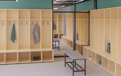 celolaminové otevřené šatní skříně jsou koncipované do sportovišť a šaten, otevřená šatní část obsahuje 2x trojháček
