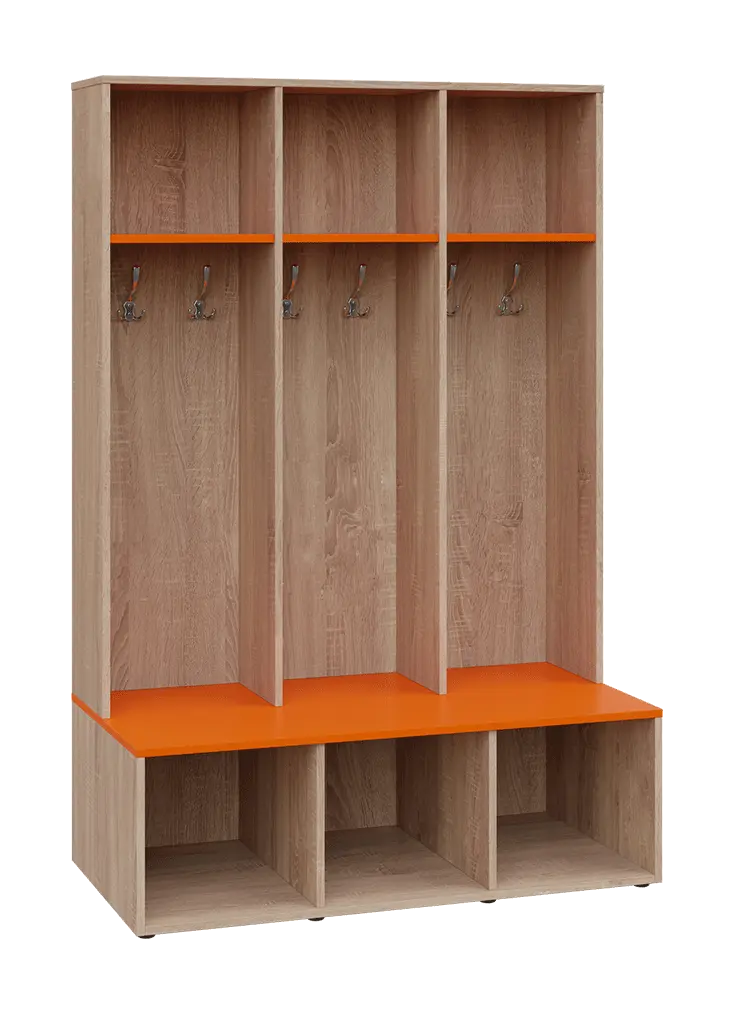 celolaminové otevřené šatní skříně jsou koncipované do sportovišť a šaten, otevřená šatní část obsahuje 2x trojháček