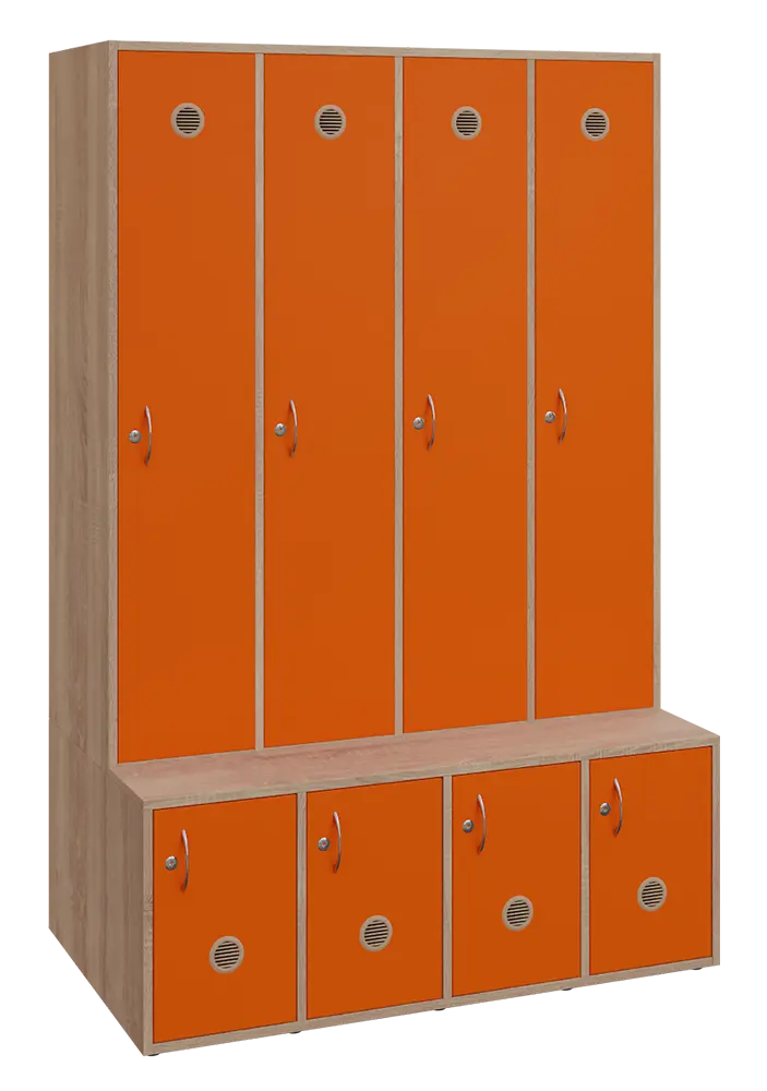 celolaminové šatní skříně, část na šaty a boty je samostatná, zároveň botník je předsazen a lze ho využít i na odkládání věci či jako šatní lavičku
