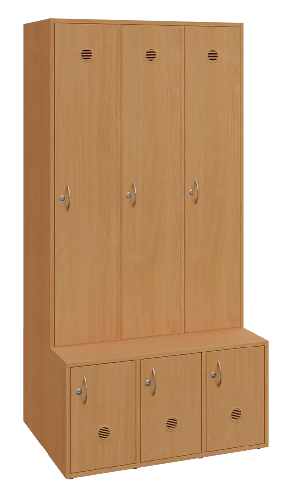 celolaminové šatní skříně, část na šaty a boty je samostatná, zároveň botník je předsazen a lze ho využít i na odkládání věci či jako šatní lavičku