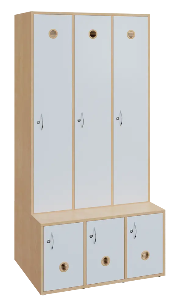 celolaminové šatní skříně, část na šaty a boty je samostatná, zároveň botník je předsazen a lze ho využít i na odkládání věci či jako šatní lavičku