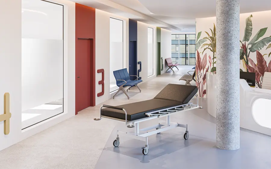 transportní lehátko s jednoduchým manuálním nastavením opěrky zad, kovová konstrukce s epoxidovým bílým lakem, sklopné bočnice z hliníku