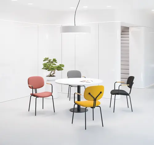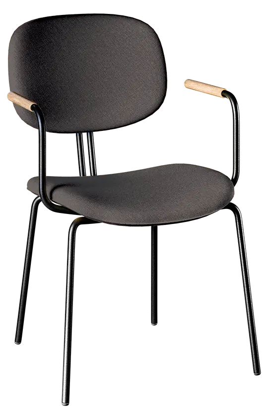 čalouněná židle s odlehčeným designem dodává prostoru vzdušnost a eleganci, jemně kulaté kovové a subtilní područky zakončené dřevem a otevřená konstrukce vytváří lehkou a vzdušnou siluetu, která opticky nezatěžuje interiér