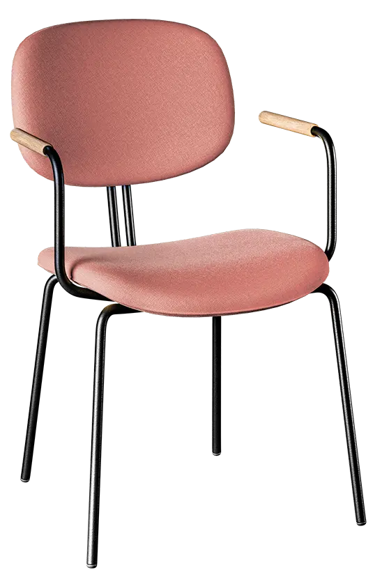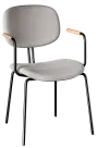 čalouněná židle s odlehčeným designem dodává prostoru vzdušnost a eleganci, jemně kulaté kovové a subtilní područky zakončené dřevem a otevřená konstrukce vytváří lehkou a vzdušnou siluetu, která opticky nezatěžuje interiér