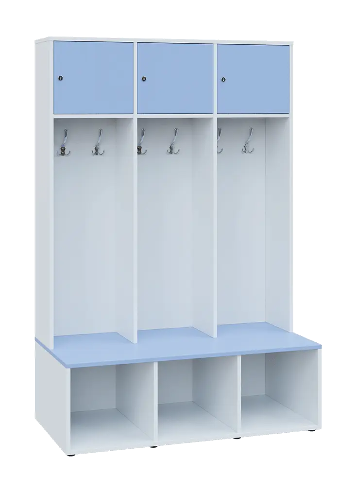 celolaminové otevřené šatní skříně jsou koncipované do sportovišť a šaten, ve vrchní části je vsazena uzamykatelná skříňka, osazena kvalitním zámkem se 2 klíči