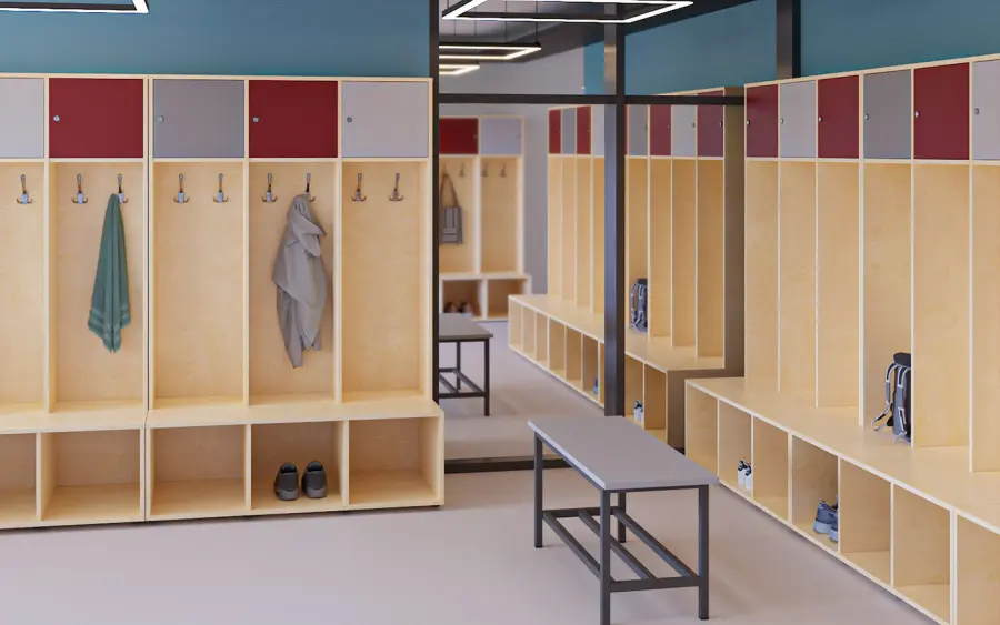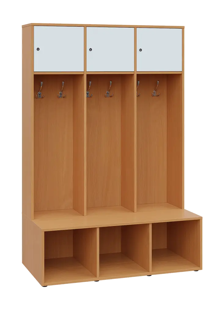 celolaminové otevřené šatní skříně jsou koncipované do sportovišť a šaten, ve vrchní části je vsazena uzamykatelná skříňka, osazena kvalitním zámkem se 2 klíči