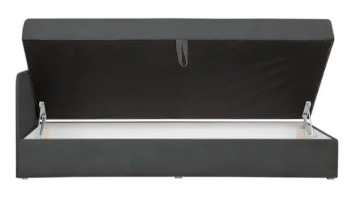 celočalouněná válenda s úložným prostorem,čalouněná opěrná deska v hlavové části, dřevěná konstrukce, matrace z kvalitní pěny, pružinový rošt