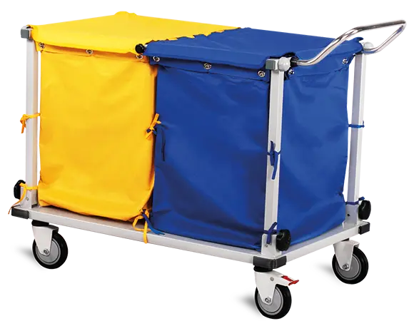 mobilní vozík na sběr a třídění odpadu nebo ložního prádla, pevná konstrukce vozíku bílé barvy,