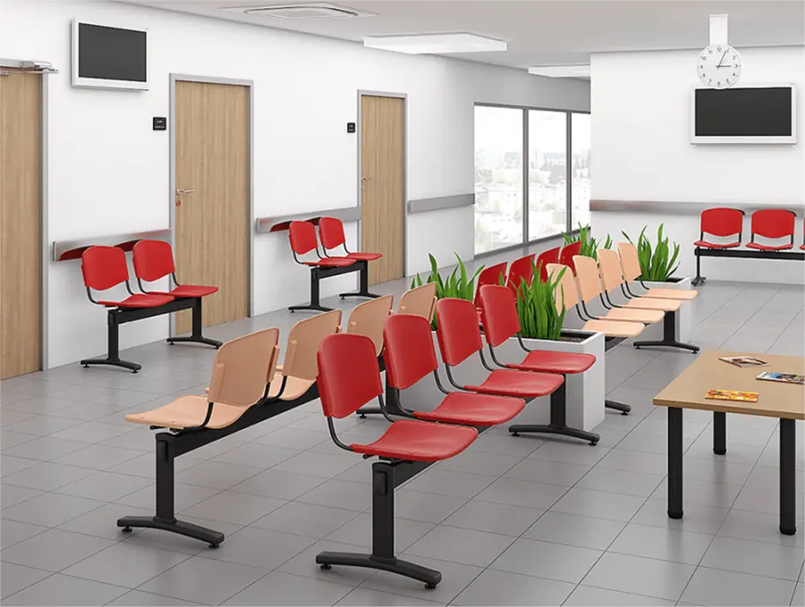 3 místná lavice s plastovými sedáky - snadná údržba, nohy v černém laku, výškově nastavitelné kluzáky pro vyrovnání nerovností podlahy