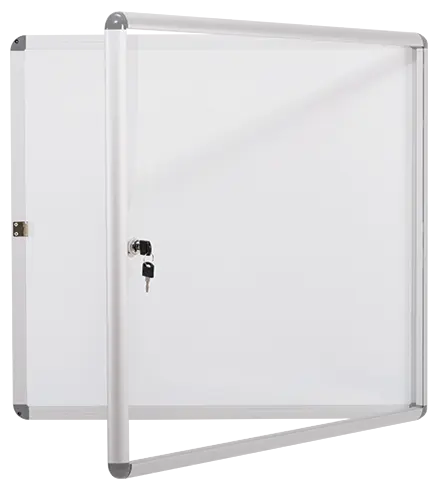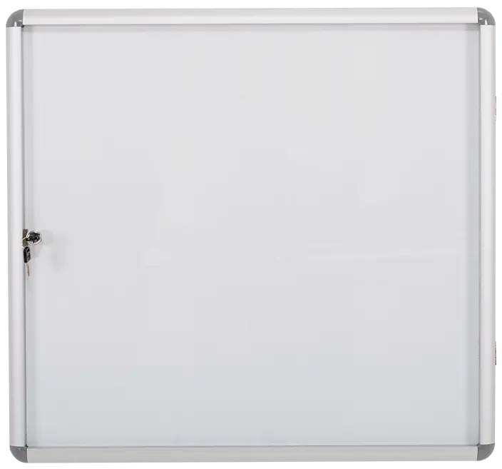 vnitřní uzamykatelná vitrína vhodná k montáži na stěnu (montážní materiál součástí balení), bílý popisovatelný magnetický povrch, hliníkový rám