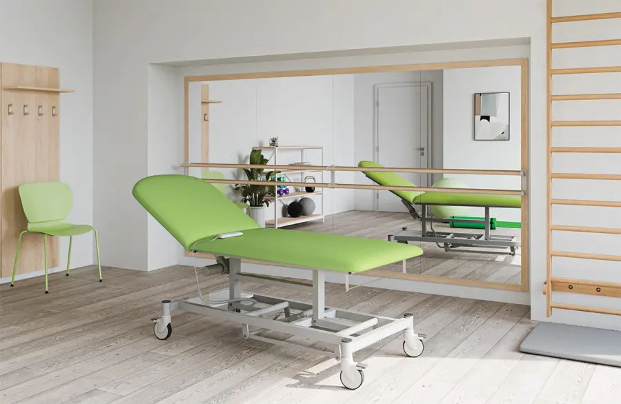 široké 2-segmentové lehátko, šířka ložné plochy 700 mm, nastavení výšky pomocí ovladače, max. zátež lehátka 240 kg