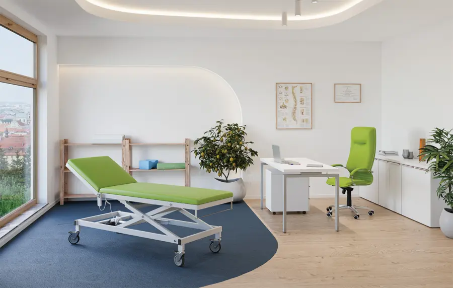 jednomotorové lehátko s elektrickým nastavením výšky stolu, nastavitelný hlavový díl, komfortní pěnová matrace opatřená kvalitní koženkou