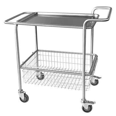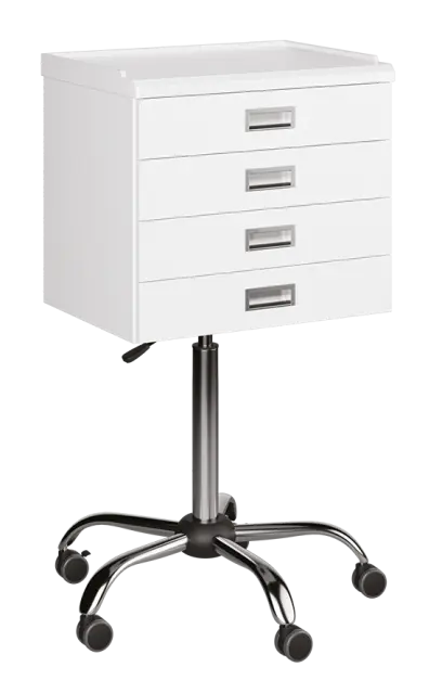zdravotnický vozík ze svařovaného hliníkového rámu s antivibračními vlastnostmi, zásuvky obsahuji variabilní dělící příčky a protiskluzovou podložku, výsuvná pracovní deska