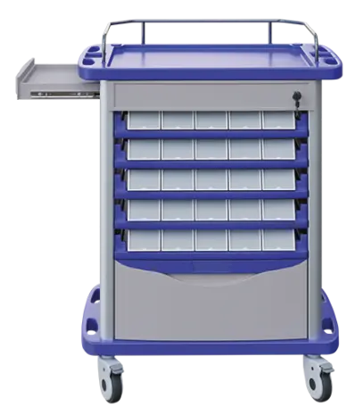 praktické víceúčelové vozíky s oboustrannými zásuvkami na léky nebo na drobný zdravotnický materiál, zdravotnický vozík ze svařovaného hliníkového rámu s antivibračními vlastnostmi