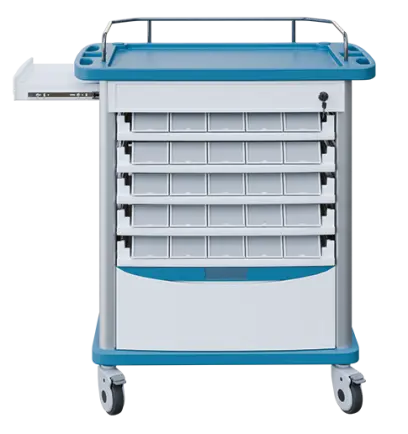 praktické víceúčelové vozíky s oboustrannými zásuvkami na léky nebo na drobný zdravotnický materiál, zdravotnický vozík ze svařovaného hliníkového rámu s antivibračními vlastnostmi