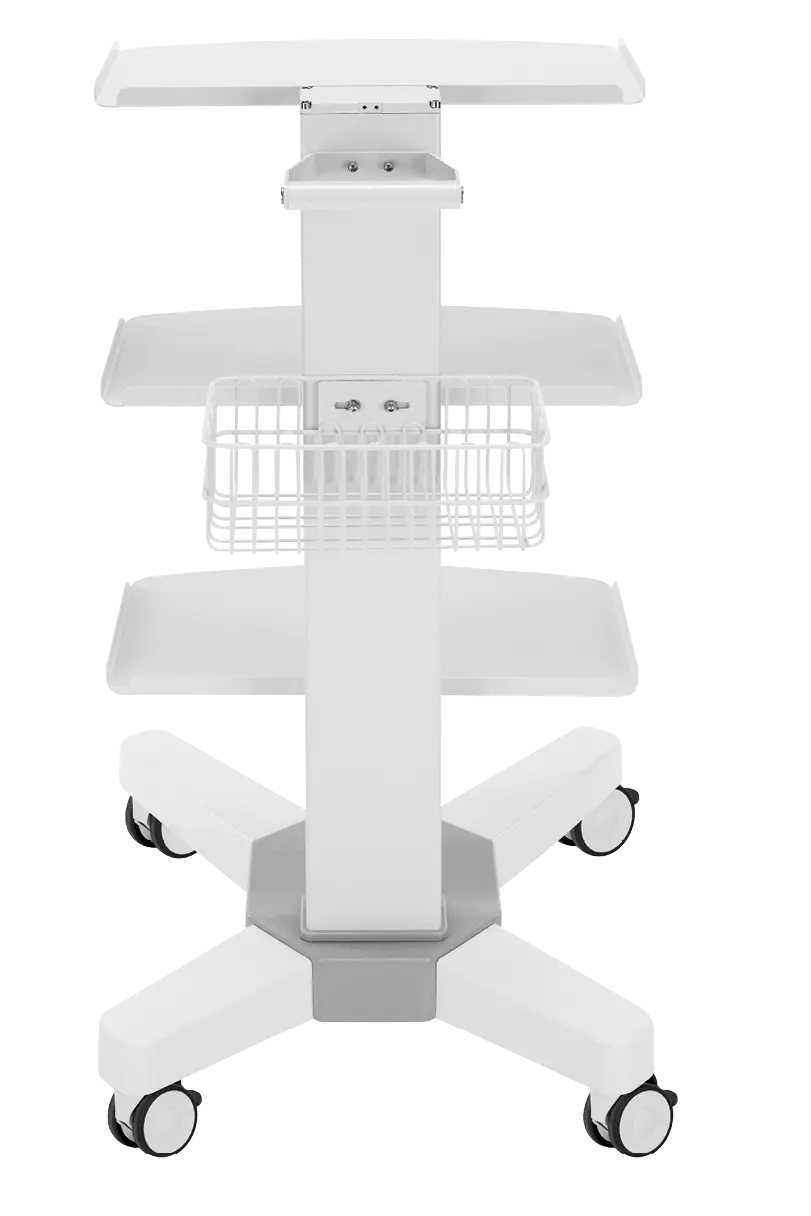 praktický policový přístrojový vozík, VPI vozík umožňuje díky speciálně profilovaným sloupkům výškovou přestavitelnost polic přesně dle používaných přístrojů a potřeby přístupu