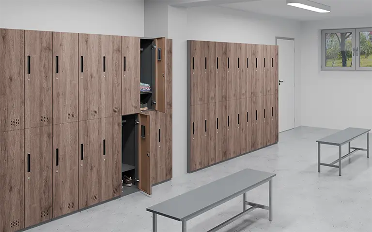 šestiboxová uzamykatelná kovová šatní skříň, dveře v unikátním provedení imitace dřeva, bezrámový design - dvířka kompletně překrývají korpus šatní skříně