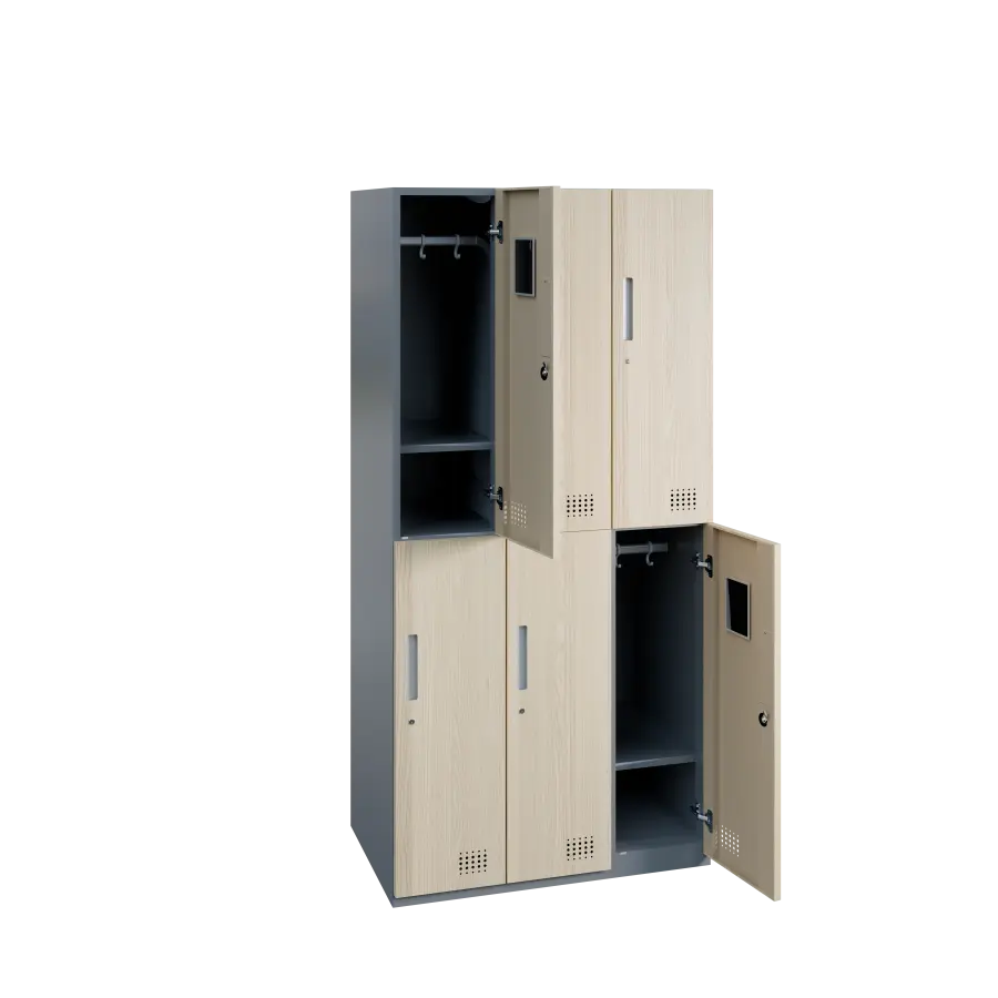 šestiboxová uzamykatelná kovová šatní skříň, dveře v unikátním provedení imitace dřeva, bezrámový design - dvířka kompletně překrývají korpus šatní skříně