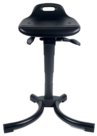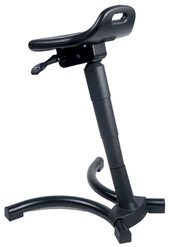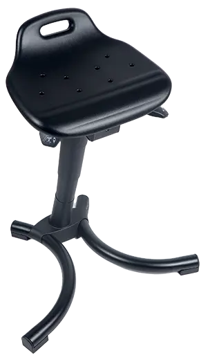 podpěrná stolička pro dlouhodobé stání, sedák z lehce udržovatelné PUR pěny, stavitelný sklon sedáku, stabilní základna opatřena práškovým lakem s protiskluzovými patkami