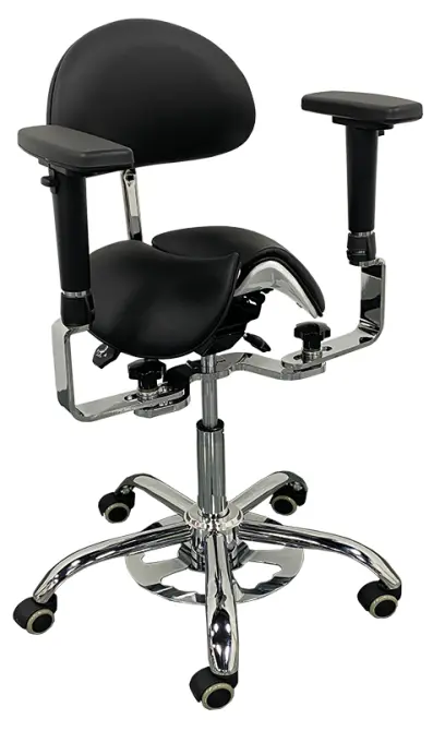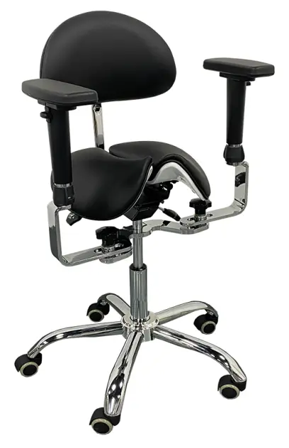 ergonomická sedlová židle s děleným sedákem pro snížení zátěže na pánevní dno, široká zádová opěrka s nastavením výšky a sklonu, čalouněno v černé kožence, chromovaný kříž