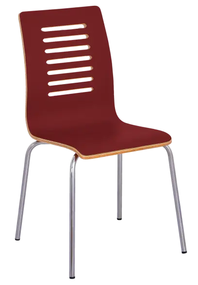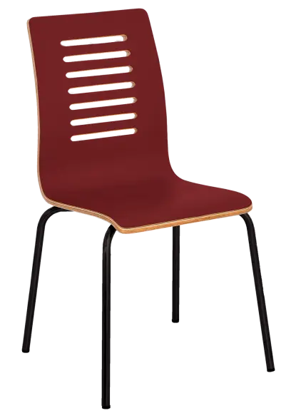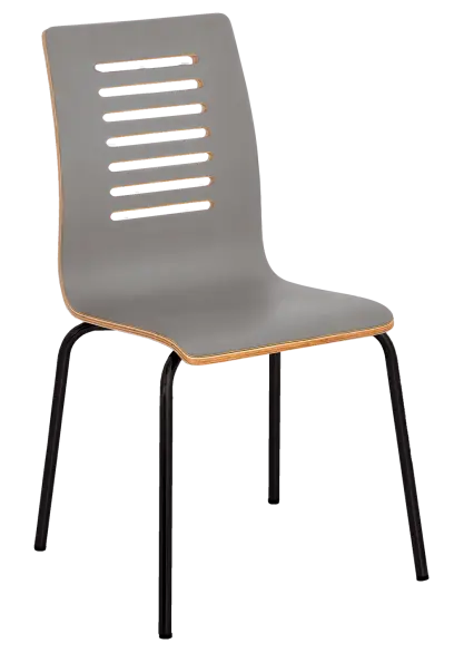 stohovatelná židle na svařované kovové kostře v černém nástřiku, sedák a opěrák z dubové překližky s povrchovou úpravou transparentního laku, plastové kluzáky na ochranu podlahových krytin